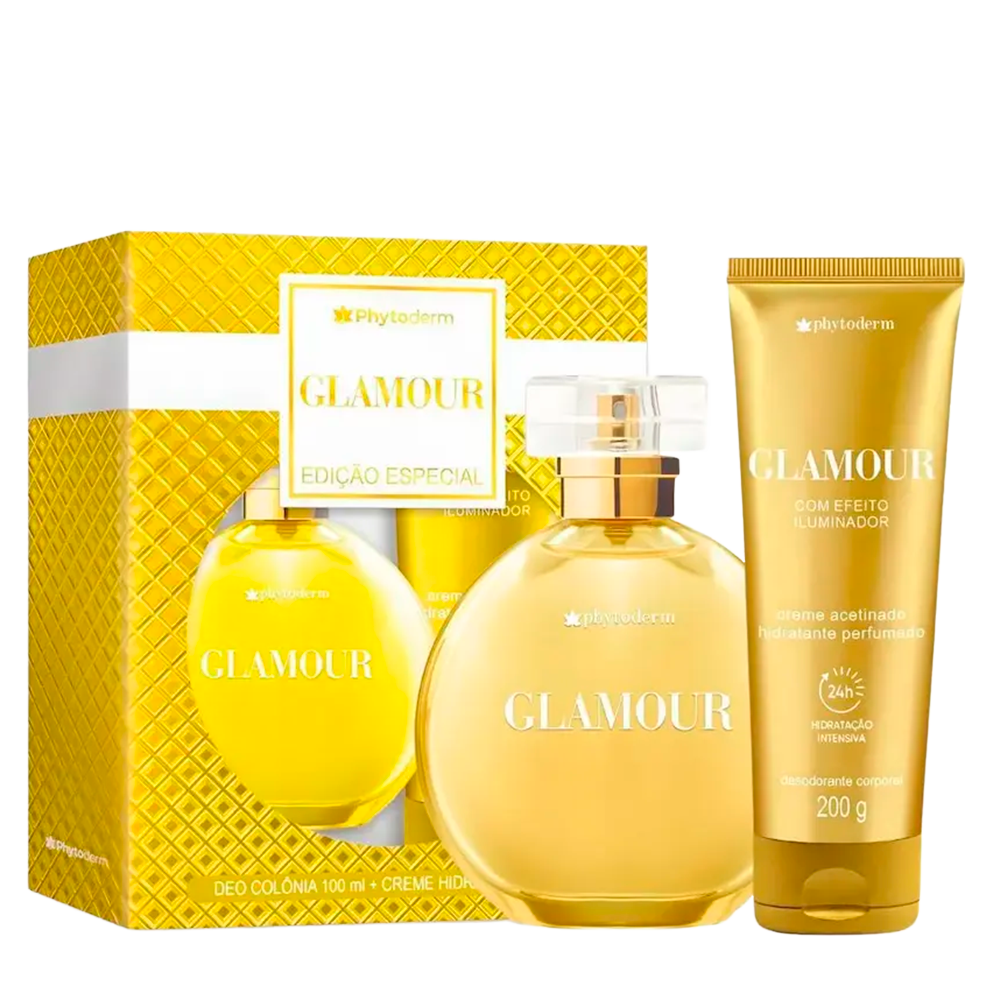 A colônia traz notas florais e frutadas, que se misturam harmoniosamente em uma fragrância marcante, moderna e feminina. Já o Creme Acetinado Phytoderm Glamour possui textura leve, fácil absorção e hidrata profundamente, deixando a pele macia, perfumada e com toque aveludado por horas.