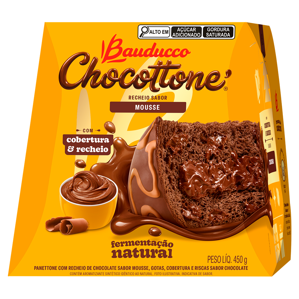 Feito com a tradicional massa macia e aerada da Bauducco, este Chocottone é recheado com um cremoso mousse de chocolate, garantindo uma explosão de sabor a cada fatia.